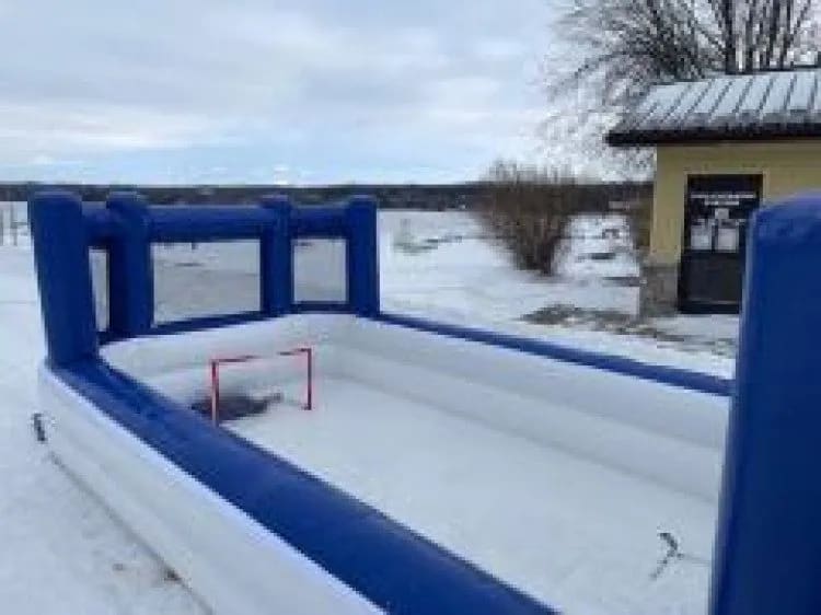 This inflatable mini stick hockey arena is sure to be a hit at any event. It's the ultimate mini stick showdown! Designed to provide hours of mini stick fun, this inflatable structure provides boards and a back wall to keep the ball in play!