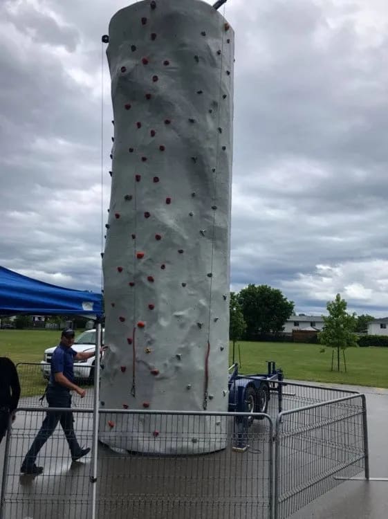 There are climbing stations on each wall, presenting easy, medium and difficult terrains, and you can have 3 climbers at a time. We inspect our cables and hydraulic cylinders on a daily basis to ensure the ultimate in safety. Our operators will take the time to work with all patrons in doing the best that they can do. 10’x10’ set-up space. 24’H